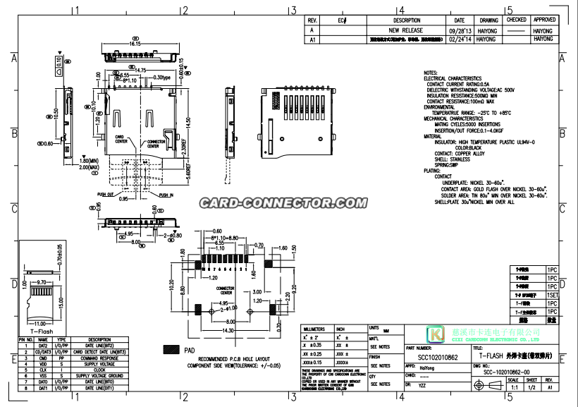 This is the most commonly used micro sd card connector with double shrapnel and external soldering.