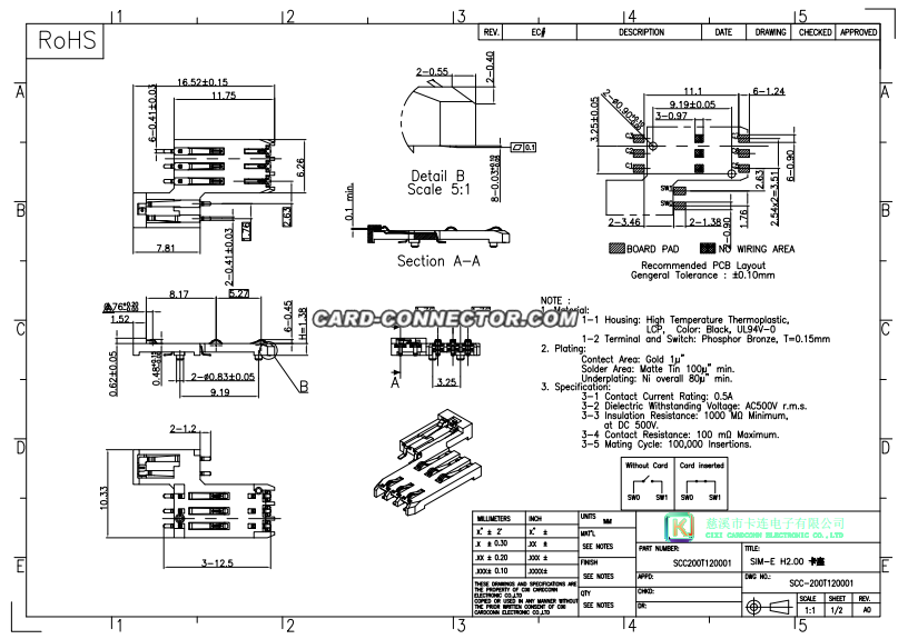smart card connector with a height of 2.0mm, 6+2pin, model: SCC200T120001.